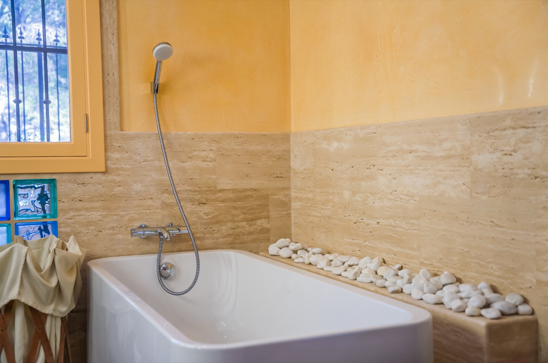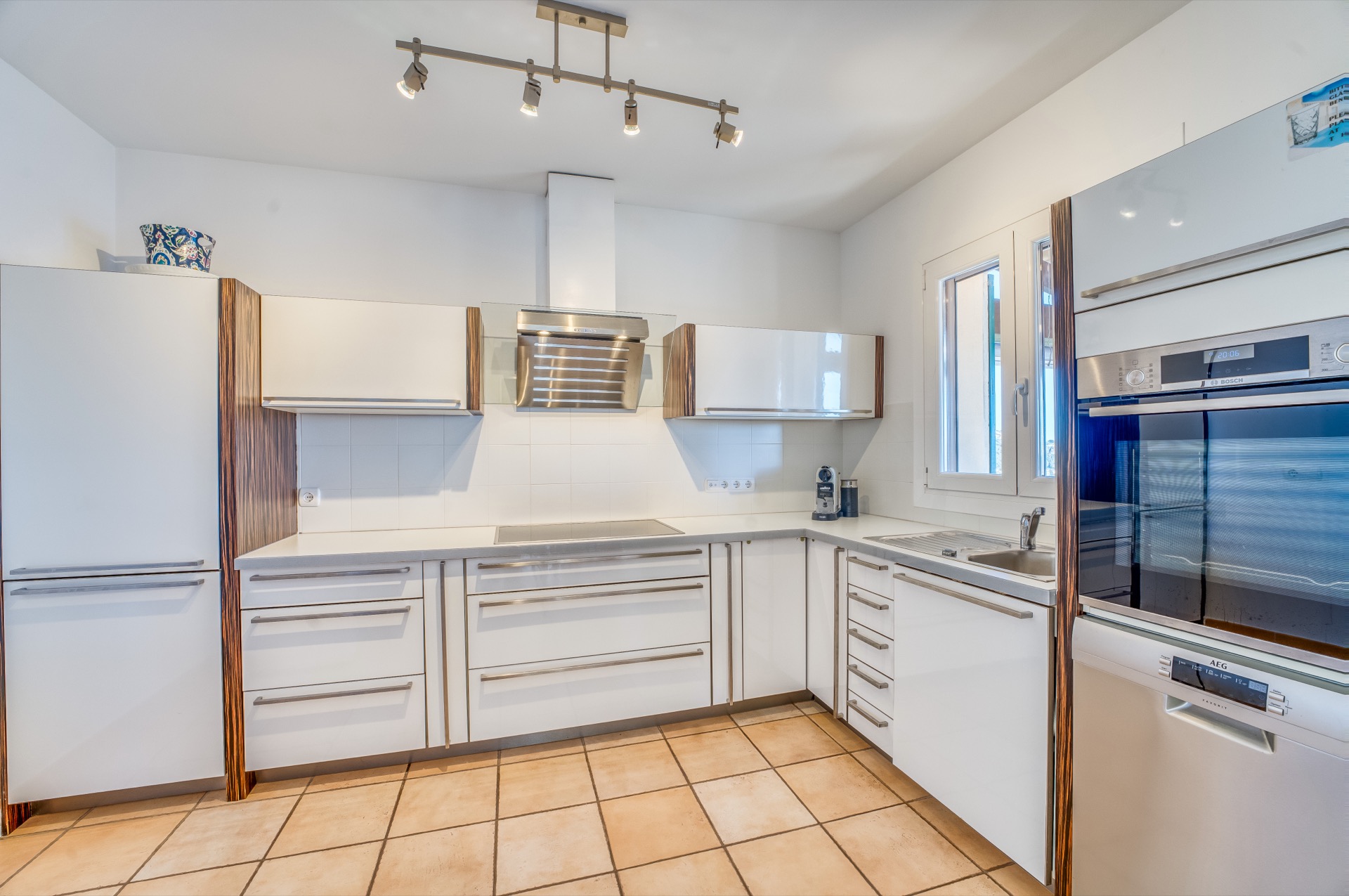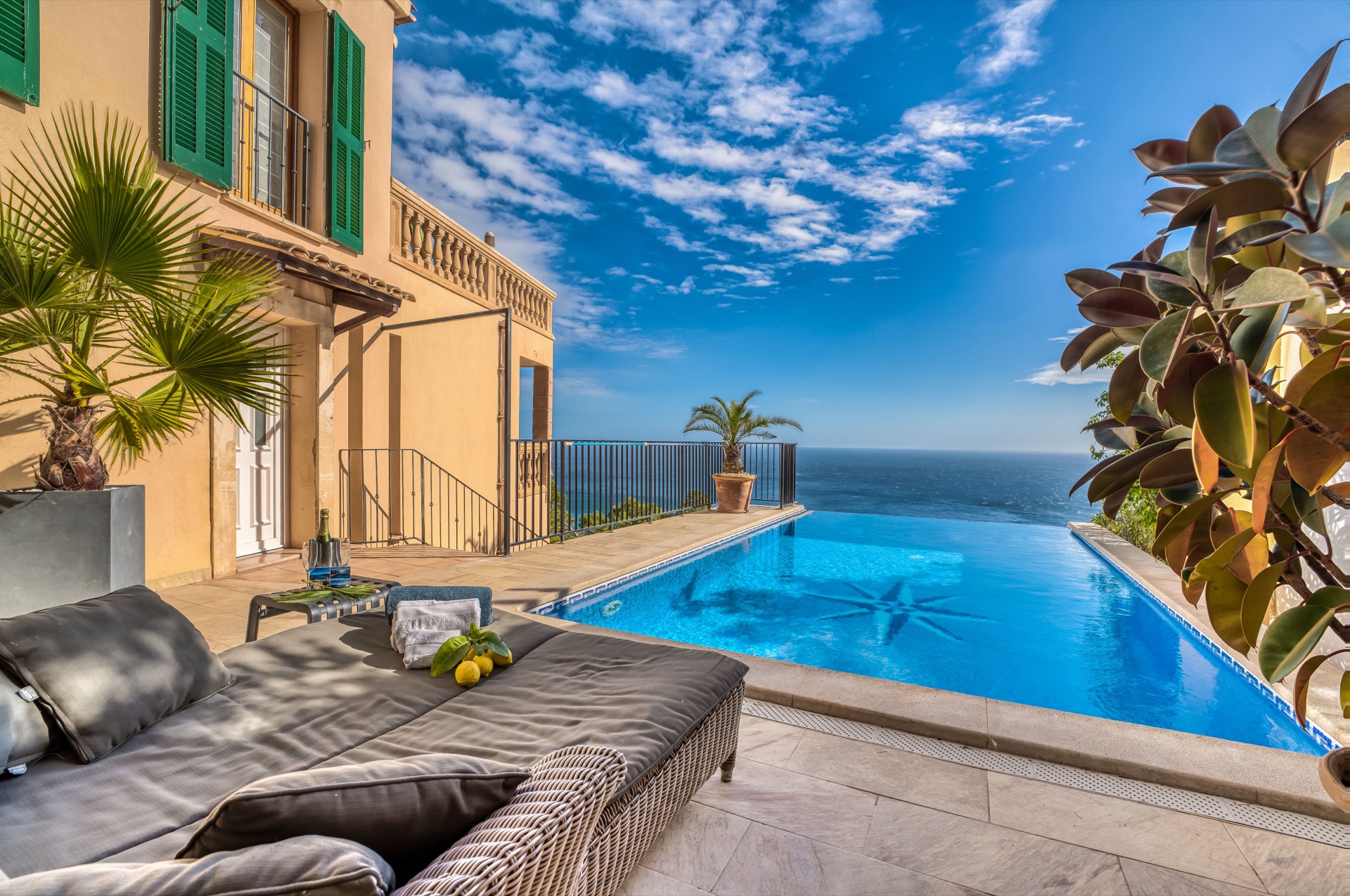 Das Herzstück der Villa: ein 28 m² großer beheizbarer Infinity-Pool mit perlmuttfarbenen Fliesen, dessen Wasser scheinbar nahtlos ins Mittelmeer übergeht. Ganzjährig beheizbar für perfekten Badegenuss — auch in der Nebensaison.