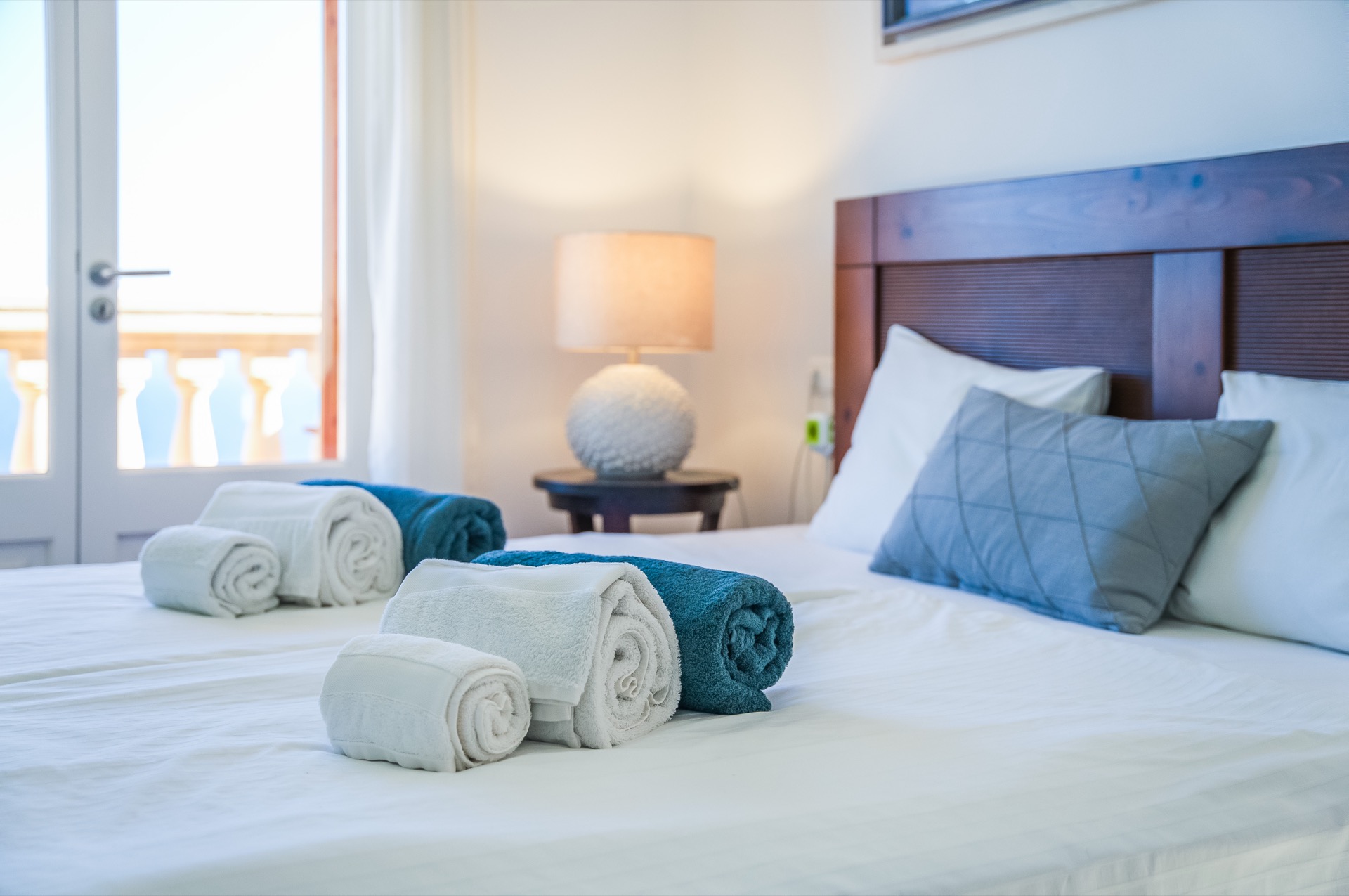 Luxuriöses Himmelbett, Ensuite-Bad mit Regendusche und freistehender Badewanne, direkter Meerblick